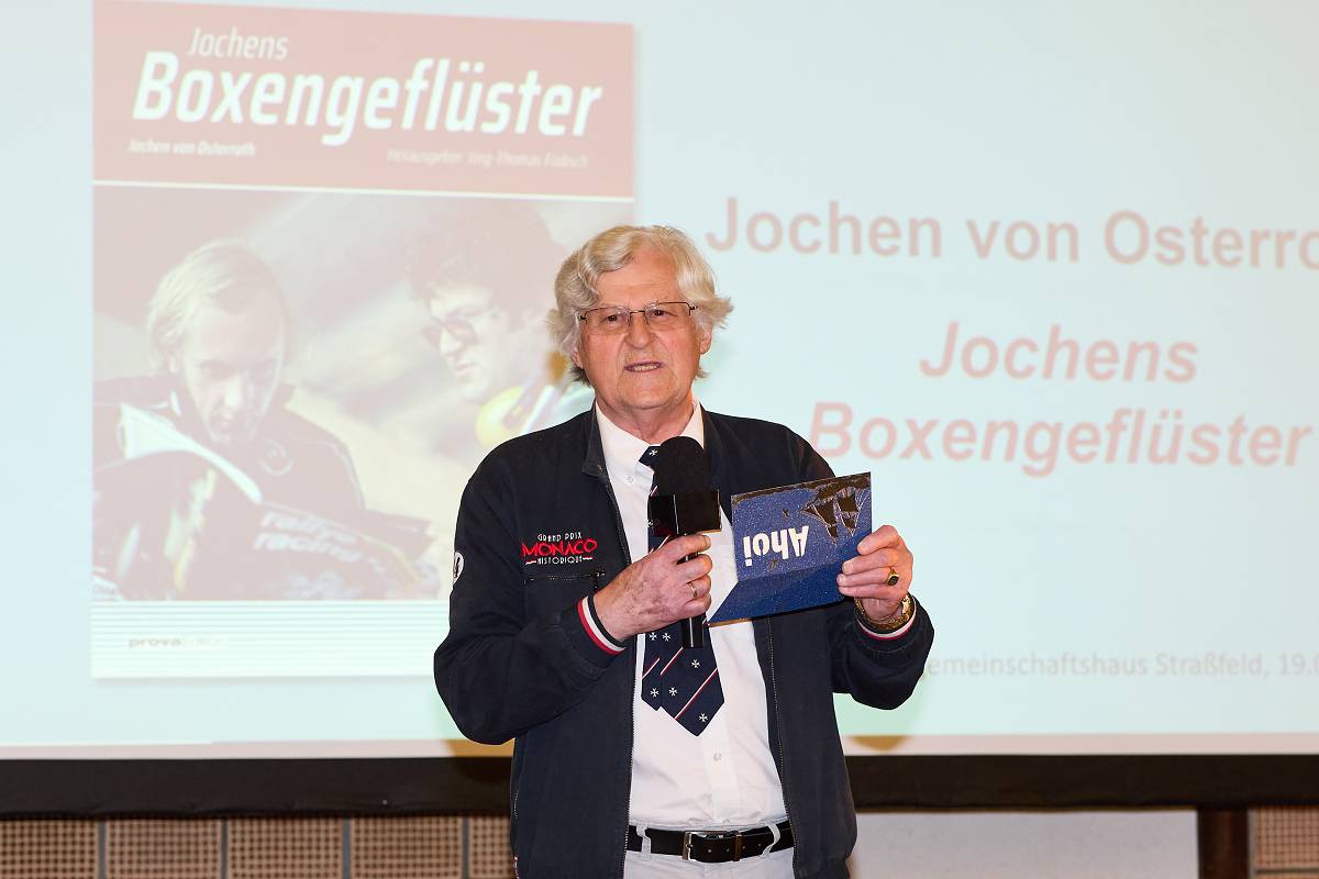 Im Rahmen der 10. Swisttaler Lesetage kamen Rennsportfans – wie in den Jahren zuvor – voll auf ihre Kosten: Jochen von Osterroth stellte sein Buch „Boxengeflüster“, von Jörg-Thomas Födisch in der prova edition herausgegeben, am 19. September im Straßfelder Dorfgemeinschaftshaus vor.